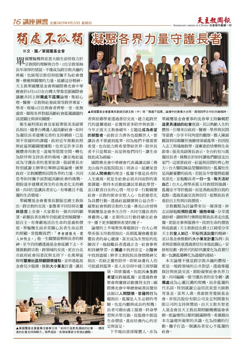 臺灣已邁入超高齡社會,有鑑於超高齡社會孤獨問題日益嚴峻,由天主教單國璽基金會與國際佛光會中華總會共同主辦的《獨處不孤獨》論壇,於8月24日假台大集思館國際會議廳登場,集結心理、醫療、宗教與社會政策等跨界專家學者,現場400位與會者座無虛席,顯見社會各界對高齡孤獨議題的高度關注。