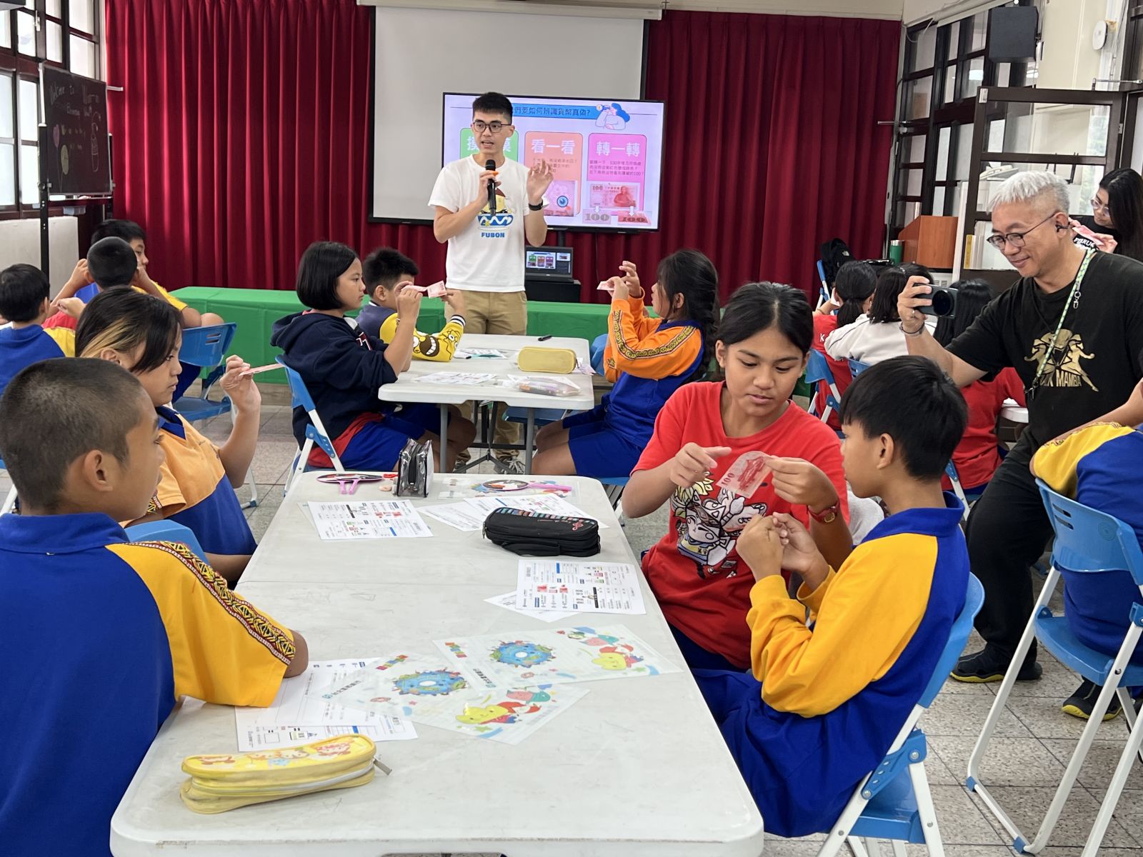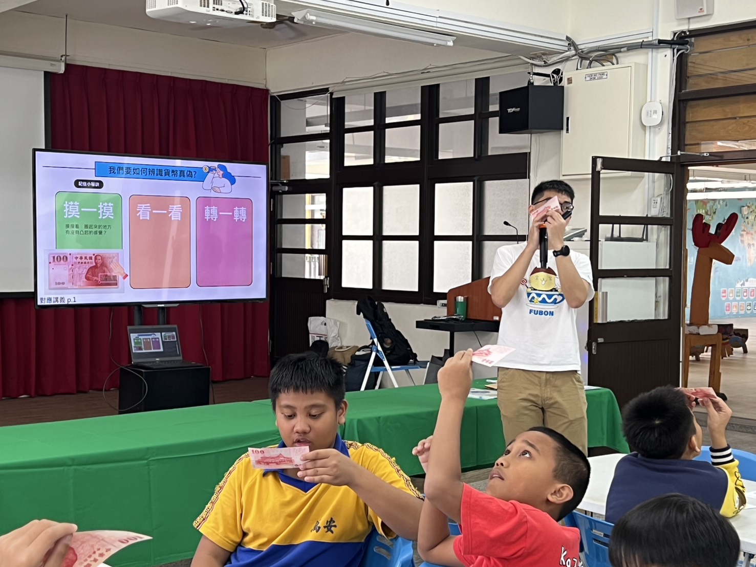 課程同時帶入新臺幣與防偽設計的小知識,介紹不同面額紙鈔與硬幣,並示範「摸一摸、看一看、轉一轉」三步驟認識真鈔。孩子們更可以實際拿到真鈔,觀察鈔票上的凸印字樣、水印、安全線與變色數字,甚至發現肉眼不易察覺的微縮文字,在遊戲式體驗中,對貨幣與金融安全有了更具體的認識。